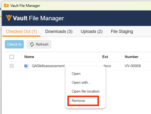 In the event that someone uses the Undo Checkout action from Vault on a document that is checked out to Vault File Manager, Vault File Manager does not automatically delete the checked out file. In this situation, right-click the file in Vault File Manager and select Remove to remove the file from Vault File Manager.