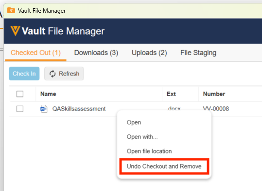 To undo a checkout in Vault File Manager, right-click a single document and select Undo Checkout and Remove. This simultaneously removes the file from Vault File Manager and reverts the checkout in Vault.