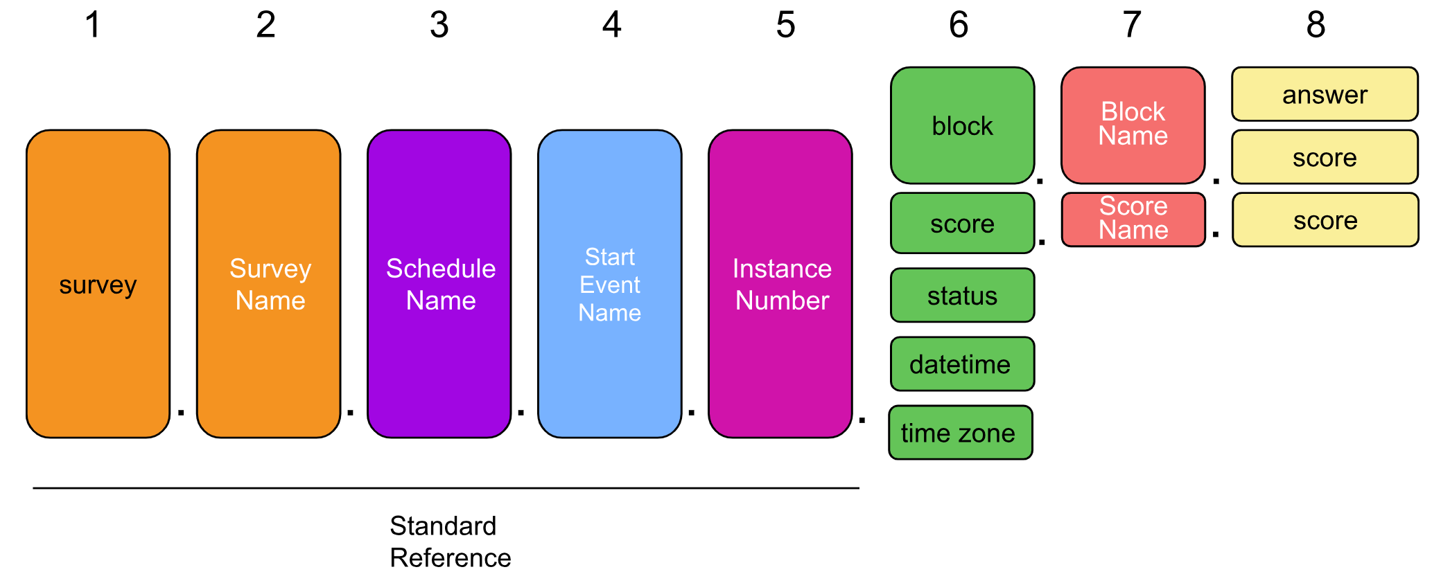 A standard reference that uses survey as the first object includes a minimum of five values that are separated by periods. The objects below are included in a standard survey reference in the order in which they are displayed.